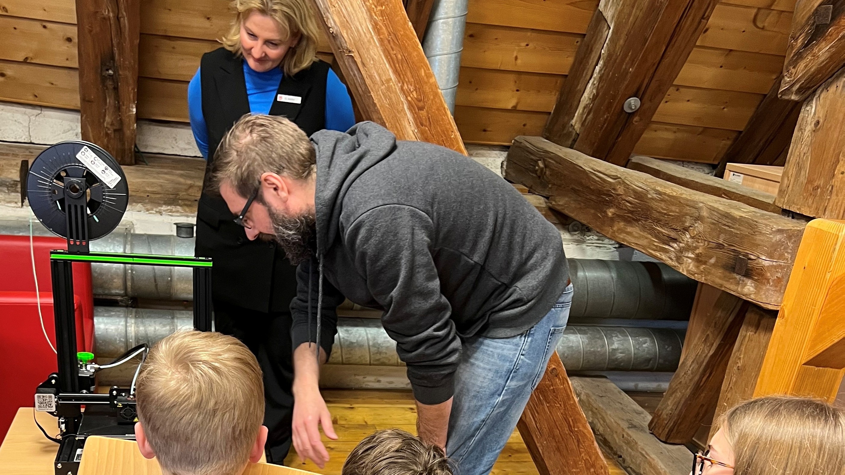 Bevor die Kinder loslegen konnten, erklärten die Mitarbeiter des BayernLab, wie 3D-Druck funktioniert. Die Kinder verfolgten anschließend unmittelbar, wie der mitgebrachte 3D-Drucker in der Praxis arbeitet.