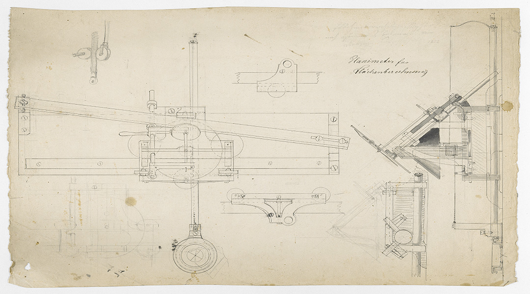 Vor 200 Jahren kam dem bayrischen Trigonometer Johann Martin Hermann (1785-1841) die Idee zum ersten Planimeter. Das Instrument konnte den Inhalt einer Fläche, deren Grenzen krumm und unregelmäßig verlaufen, erstmals exakt berechnen. In den Anfangsjahren der bayrischen Landesvermessung war dies von großer Bedeutung für die Steuerberechnung. Ein Planimeter fährt die Grenzlinien eines Grundstücks auf einer Zeichnung ab und ermittelt den Flächeninhalt mechanisch mittels kontinuierlicher Multiplikation, also Integralrechnung.